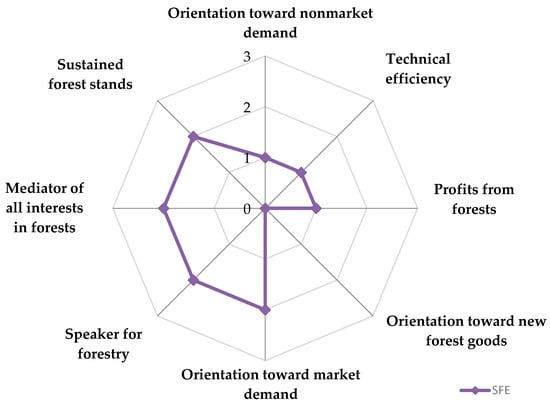 SFEs had access to some external sources in the past, the most conclusive examples being the so-called “carbon” payments received to reduce greenhouse gas emissions. SFEs actively participated in two projects developed within the Clean Development Mechanism under the Kyoto Protocol (1997) and the United Nations Frame Framework Convention on Climate Change (UNFCCC, 1992) []. As a result of these projects, SFEs received 7,900,705 USD between 2006 and 2016 []. These funds were unevenly distributed among SFEs participating in afforestation activities and represented, on average, not more than 4% of SFEs’ revenues []. As a result, the performance of the SFEs for the criterion Orientation toward nonmarket demand C2 was evaluated as weak or (1).