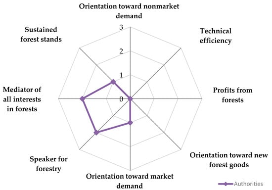 As presented in Section 2, two main institutional bodies share responsibilities for the forest sector development in the country—MARDE and Moldsilva. MARDE conducts permanent assessments of the sector’s status, elaborates public policy and sector-specific regulations, and makes decisions on strategic interventions and enforcement efforts. Moldsilva also has numerous authority tasks, such as (1) identifying the sector’s priorities, to elaborate proposals for strategic planning and policy elaboration as well as to organize and coordinate sectoral enforcement; (2) developing and maintaining the sectoral informational database; (3) providing services to other forest owners (mainly LPAs); (4) elaborating FMPs; and (5) guiding the diversification of forest products and services adjustable with marketing strategies [,]. Although Moldsilva is a self-financing agency with strong institutional independence, it is still subordinate to MARDE; therefore, in this research, the analysis of institutions’ performance regarding authority tasks included both MARDE and Moldsilva. The evaluation considered all eight criteria recommended by the adopted methodology [] and 15 adapted indicators (Table 1). The results are illustrated in a spider net chart (Figure 3) and in Table S2.