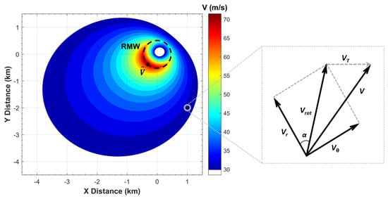 Wind field of a left to right translating vortex with VT = 13 m/s, Gmax = 4.5, RMW = 483 m, α = 45°, φ = 0.55 (Left) and decomposition of the velocity components of the Rankine vortex model (Right) (after []).