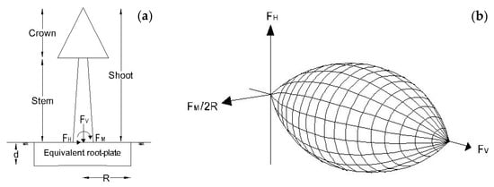 Windthrow model development. (a) Schematic tree representation under general loading condition and (b) failure load surface in the FV-FH-FM/2R space (after []).