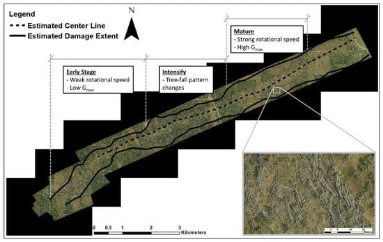 A series of aerial photos were acquired ten days after the tornado from the Northern Tornadoes Project [] by a plane flying at approximately 300 m above the track. Orthomosaic images at a pixel resolution of 5 cm were produced, and the tornado centerline and damage extent were estimated as shown in Figure 3. The tornado centerline was estimated based on the location where the most extensive damage happened [], while the damage extent was estimated according to the location of the furthest damaged tree on both sides (north and south) of the tornado center.