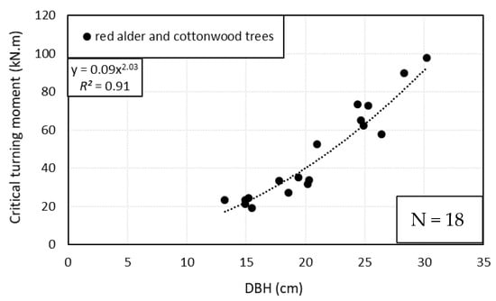 Due to the scarcity of information on the uprooting resistance of trembling aspen in the literature, the winching test results of similar hardwood species such as red alder (Alnus rubra Bong) trees [] and Fremont cottonwood (Populus fremontii Wats) trees [] were used for the model calibration. These two datasets have been combined, and the strongest correlation was observed between the critical overturning moment (FM) and the diameter at breast height (DBH) as presented in Figure 4. Thus, for these hardwood species (e.g., red alder, cottonwood, trembling aspen, etc.), the critical overturning moment can be calculated using Equation (9).