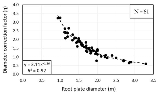 The windthrow analysis of the sample of 61 uprooted trees indicated that a correction factor needs to be applied to the root plate diameter to correctly fit the failure envelope in FV-FH-FM/2R space. This correction factor (η) is found to be a function of the root plate diameter as shown in Figure 5, and it can be estimated using the power function in Equation (11). This has been found for other species of trees and is thought to be due to allometric changes in the crown, trunk and roots as trees mature [].