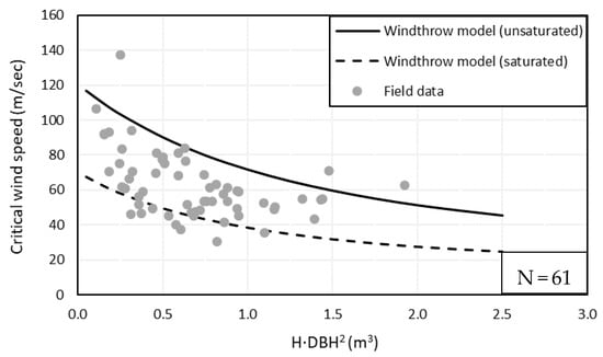 The windthrow model was validated using a different set of 12 trembling aspen trees with a tree volume (H·DBH2) varying between 0.05 and 2.5 m3 (described in Table S2). The wind load responsible for tree uprooting (FH) was calculated using Equation (2) considering the corrected root-plate diameter (i.e., 2Rc = η × 2R). The critical wind speed (Vc) was then back calculated from Equation (10).