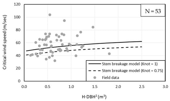 The stem breakage model (i.e., Equation (12)) was applied on a different set of 12 trembling aspen trees (Table S4) with a tree volume (H·DBH2) between 0.05 and 2.5 m3, and these results are presented in Figure 7. As can be observed from the figure, trees with Knot = 0.75 have lower stem breakage resistance than those with Knot = 1.0 due to the presence of knots/burls within their stems.