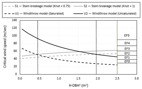 Relationships between critical wind speed and H·DBH2 for uprooted and stem broken trees.