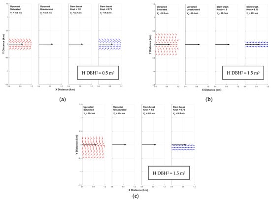For Figure 10, the Gmax is increased to 6 with all the other parameters kept the same. Consequently, the Vmax is increased to 91 m/s approximating a strong EF4 tornado. As the wind speed of the simulated tornado is increased, the treefall pattern is produced for all scenarios with a significant increase in damage width. For H·DBH2 of 1.5 m3, the critical wind speed is the greatest for U2 and thus the damage width is the smallest. Furthermore, in contrast to Figure 9, the treefall pattern is changed considerably where the treefall direction points towards the center of the vortex, because a tornado with a high Gmax would now have a relatively stronger rotational speed and weaker translational wind speed. The trees along the convergence line now point in the opposite direction to the translation of the tornado (backwards convergence). This type of treefall pattern is usually found in tornadoes EF4 or greater []. This treefall pattern was observed in the mature (later) stages of the Alonsa, MB tornado suggesting to some extent that the tornado was in fact a violent tornado, although a more detailed treefall analysis is necessary to estimate the actual wind speed. As opposed to Figure 9, the treefall pattern converges on the north side of the tornado center for Figure 10, because the treefall directions point in the opposite direction of translation for Gmax of 6 and rotate clockwise as alpha is increased to 30°. Figure S7a–c shows the same plots for smaller volume trees and captures very similar results.
