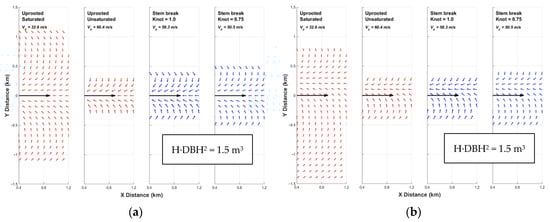 In this section, to model a more realistic forest, a treefall pattern is generated where a random H·DBH2 is assigned to each grid point using a Gaussian distribution. The mean (0.68 m3) and standard deviation (0.36 m3) were those obtained from the 114 sample trees. Two different soil conditions are assumed, in which both uprooting and stem breakage can occur: (1) unsaturated soil with a knot factor of 0.75, (2) saturated soil with a knot factor of 0.75. Figure 11a,b and Figure 11c,d show the treefall pattern with the random H·DBH2 distribution simulated with the same tornado as Figure 9 and Figure 10, respectively. Due to the tangential wind component (α = 30°), the same effects shown in Figure 9c and Figure 10b can be observed where the treefall pattern converges on the south side and the north side of the tornado center for Figure 11a,b and Figure 11c,d, respectively. For the unsaturated soil, only stem breakage failure occurs in Figure 11a,c, because the critical wind speed value of uprooting is much higher than that of stem breakage. The critical wind speed of stem breakage is higher than that of uprooting when H·DBH2 reaches 1.95 m3 (Figure 8), but the chance of a tree with an H·DBH2 of 1.95 m3 occurring is very low, since 1.95 m3 is more than 3 standard deviation above the mean H·DBH2. For the saturated soil case, the critical wind speed value of uprooting is much lower, but still higher than that of stem breakage for trees with H·DBH2 less than 0.62. Thus, a mixture of uprooting and stem breakage occurs, but with more uprooting as shown in Figure 11b,d. It is evident that the proportion of uprooting to stem breakage failure is, therefore, greatly influenced by the soil conditions and the tree size. Furthermore, the damage width with the saturated soil is slightly greater than the damage width of the unsaturated soil, as the critical wind speed of stem breakage is higher for trees with H·DBH2 greater than 0.62. As illustrated in Section 3.4.1, the damage width decreases as the critical wind speed increases. Supplementary plots for simulations for a knot factor of unity are shown in Figures S8 and S9.