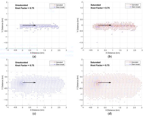 Treefall patterns of trees with random H·DBH2 and knot factor = 0.75: vortex translating with Vmax = 52 m/s, Gmax = 3 on a (a) unsaturated soil and (b) saturated soil, vortex translating with Vmax = 91 m/s, Gmax = 6 on a (c) unsaturated soil and (d) saturated soil. Other vortex parameters are kept constant as Rmax = 240 m, φ = 0.7, α = 30°.