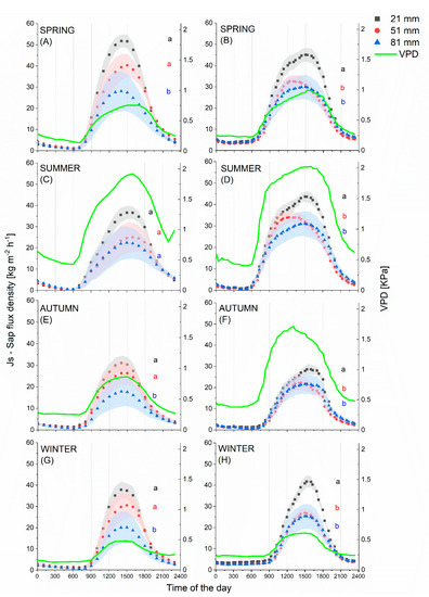 Diurnal variation of Js in the 3 radial depths and VPD in the different seasons of the year during the two study periods (dry period: A,C,E,G), wet period: B,D,F,H). Different letters indicate significant differences between the daily curves of Js in the 3 radial depths at p < 0.05 within each season and period. Symbols represent mean values (n = 5 trees) and the shaded bands represent ± SE of the means.