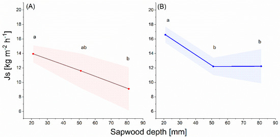 Variation of mean tree sap flux density (Js) with increasing radial sapwood depth during (A) the dry study period, and (B) the wet study period. Shaded bands represent ± SE of the mean (n = 5 trees). Different letters indicate significant differences between the 3 sapwood depths.