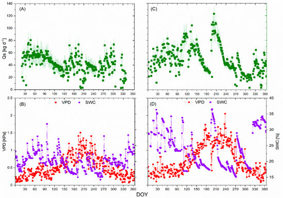 On an annual scale, Qs seemed to respond to variations in soil water content in both study periods (Figure 3), although the SWC of the dry period was substantially lower than of the wet period (Table 2), but no relationship between SWC and Qs could be established for the entire study periods (Table S2). The significant positive effect of SWC on Qs was detected only in days of high evaporative demand, when VPD was higher than 0.7 KPa (Table S2, Figure 4C,D), contrary to the negative effect of rainfall and increased Tair on sap flux density of silver fir reported by Magh et al. [57]. In line with our results, Sánchez–Costa et al. [31] observed that the sap flow of Aleppo pine in Spain responded positively to increasing soil water only on days with VPD higher than 0.4 KPa.