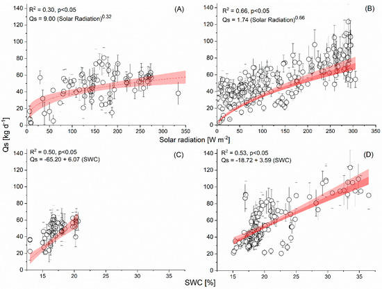 In particular, solar radiation largely controlled Qs when SWC was above 20%, and this effect was stronger in the wet (R2adj: 0.579, p < 0.001) than in the dry period (R2adj: 0.220, p < 0.001) (Table S2) and better described by an allometric relationship (Figure 4A,B).