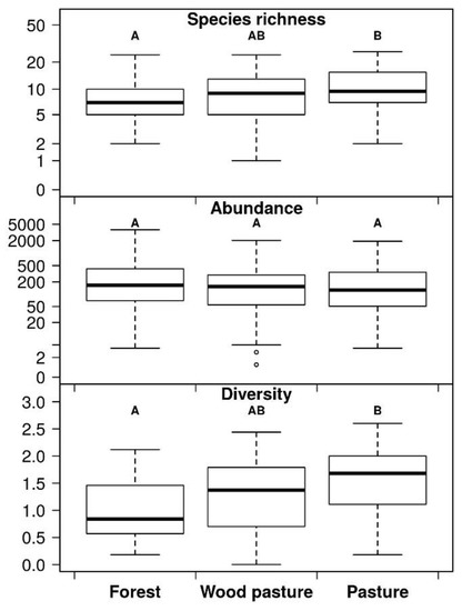 Considering habitat types, 32,917 individuals of 41 species were recorded from forests, 20,724 individuals of 47 species from wood pastures, and 24,490 individuals of 53 species from grasslands. Species richness and Shannon diversity were lower in forests than in pastures. In the case of wood pastures, these values were between the two distinct habitats. There was no difference in abundances between the three habitats (Figure 1).