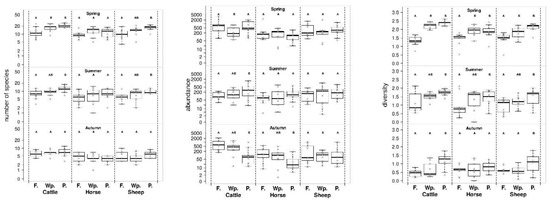 Habitat effect on dung beetle species richness, abundance, and diversity separately for dung type (columns) and seasons (rows). Box plots show medians (thick line), lower, and upper quartiles (boxes), whiskers include the range of distribution without outliers. Different letters above the boxes show the significant differences between habitats within a given season and dung type, applying generalised linear mixed models (GLMMs), linear mixed models (LMMs), and their pairwise comparisons. F.: forest, Wp.: wood pasture, and P.: pasture.