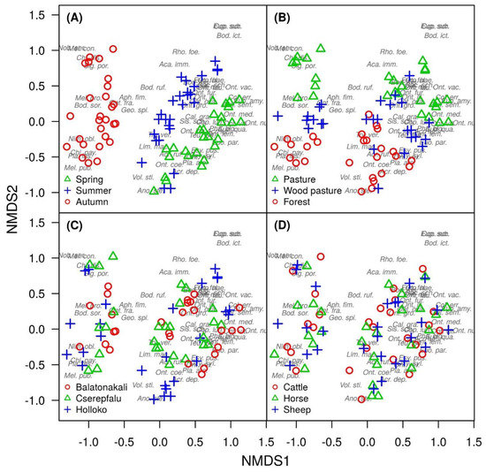 Assembly composition of dung beetles according to (A) season, (B) habitat, (C) locality, and (D) dung type, applying nonmetric multidimensional scaling (NMDS).