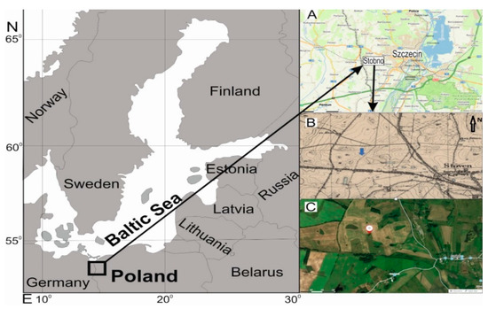 Location of the study area: (A,C)—source of the photo: https://en.mapy.cz, (B)—Meßtischblatt 2552, Kreckow, 1921, scale 1:25,000.