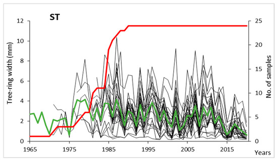 Individual sequences of tree-ring width (thin black lines), making up the local hawthorn chronology (ST; green line), and number of samples included in the chronology (red line).