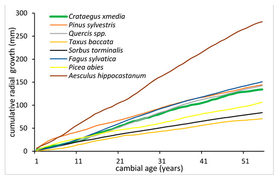 Cumulative radial growth of Crataegus media and Pinus sylvestris, Quercus spp., Picea abies, Fagus sylvatica, Taxus baccata, Sorbus torminalis, Aesculus hippocastanum expressed in mm. Growth profiles for all species represent the mean values of the species population from the northwestern part of Poland.