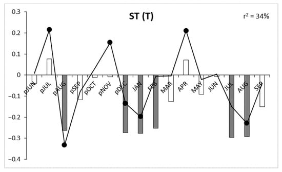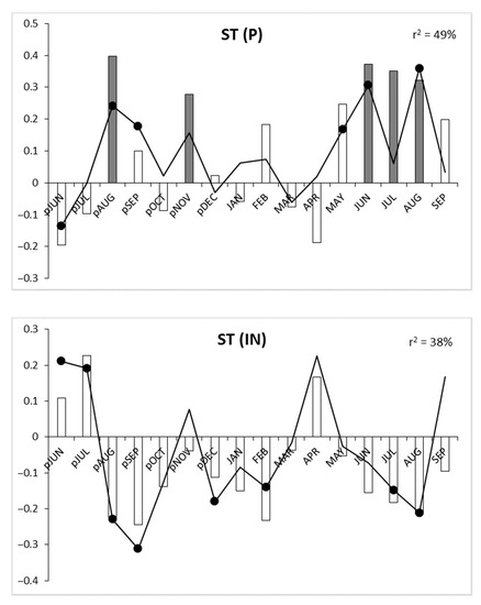 Response function analysis for air temperature—T, precipitation—P and insolation—IN. Bars depict correlation coefficients, lines show regression coefficients, significant values (p ≤ 0.05) are indicated by gray bars and solid black dots, p—previous year, r2—multiple regression determination coefficients.