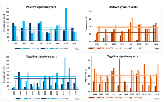 Precipitation in June, July and August (blue bars) in positive and negative signature years in comparison to the average precipitation in June, July and August of the years 1948–2020 (blue lines). Temperature in June, July and August (orange bars) in positive and negative signature years in comparison to the average temperature in June, July and August of the years 1948–2020 (orange lines).