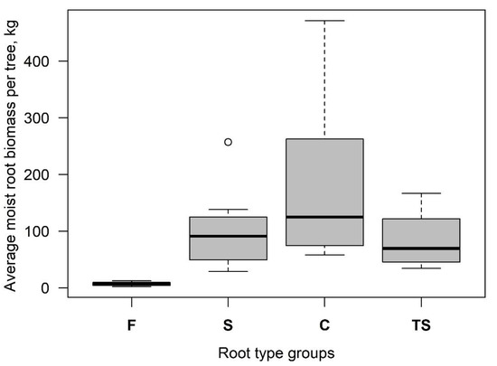 Vertical rooting is an important factor that ensures tree resistance: the larger a tree’s root system, the less prone it is to wind-throw [19]. In many cases, trees are able to adapt to growing conditions and form different types of roots to increase their resistance to wind [40]. In our study, the aspen root system was divided into four groups, and average root biomass values differed between these groups. The largest naturally moist root biomass was for C roots, and F root biomass was significantly lower than biomass in any other root group (Figure 1). Naturally moist root biomass values were lower for TS than for C or S roots. Furthermore, the biomass of all root groups had a strong correlation with DBH. Therefore, with increasing DBH, an increase in root biomass can be observed in aspen stands.