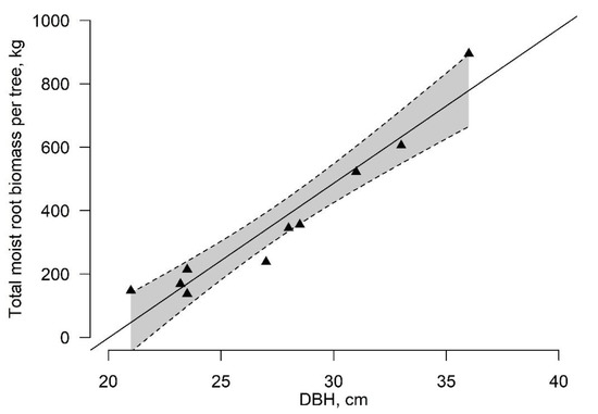 Several authors [25,28,41] have studied the relationship between the aboveground parts of the tree and the root system. Direct relationships between the root-plate width and depth had been found [12], determining root plate volume. Root plate volume has a close relationship with tree DBH, as established for European beech and Norway spruce [31], which was later confirmed in studies by other authors [30,42,43]. In our study, aspen DBH and total root biomass had a close relationship, as the correlation coefficient (r = 0.96) indicated a good model fit. Thus, our study hypothesis was confirmed (Figure 2).