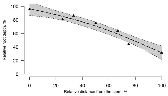 Relative root depth and relative distance from the stem were used as model predictors to assess the structural root-plate depth distribution of common aspen (Figure 3). An analysis of the data obtained in the study confirmed a close, negative relationship (r = −0.96) between the relative distance from the stem and the relative root-plate depth. As the measurement point distance from the stem increased, the root depth decreased. At the edge of the root plate, relative rooting depth decreased to 31% of the total root depth.