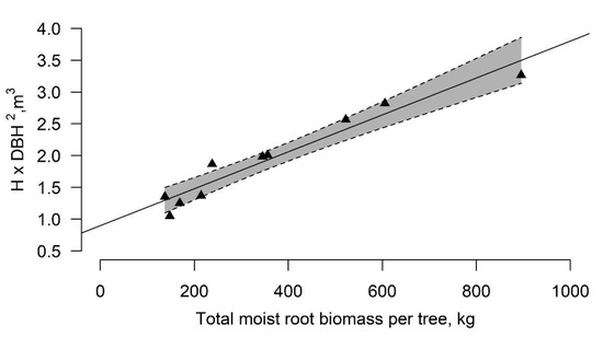 In a study on the structural root-plate characteristics of Norway spruce [43], a strong correlation (r = 0.92) between H × DBH2 and root-plate volume was observed in mineral soils. Our results are in accordance with the aforementioned study: the correlation we found between aspens’ H × DBH2 and total root biomass was strong (r = 0.97). The model showed a good fit (r = 0.97) for common aspen, and the trend indicated that with an increase in total root biomass, an increase in H × DBH2 could be observed (Figure 4).