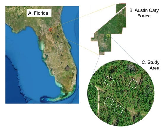 Images depicting (A) map of the state of Florida, USA extracted from world imagery basemap in ArcGIS; (B) location of Austin Cary Forest within Florida, and (C) the four 50 × 50 m permanent plots (white squares) that were used to monitor overstory dynamics and where the five understory samplings per plot were placed (locations not shown).