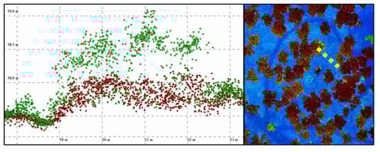 Pre- (Green) and Post-fire (Red) LiDAR point clouds for a 6 m sample profile along the transect presented in (Right) the overview map as a yellow dash line (Left).