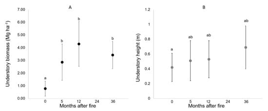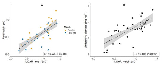 The following are available online at https://www.mdpi.com/1999-4907/12/1/38/s1, Figure S1: Relationship between LiDAR height (m) and field understory biomass (Mg ha−1) between heights measured pre-and post fire (May 2018 and November 2018 respectively) along with respective confidence intervals of their regression.