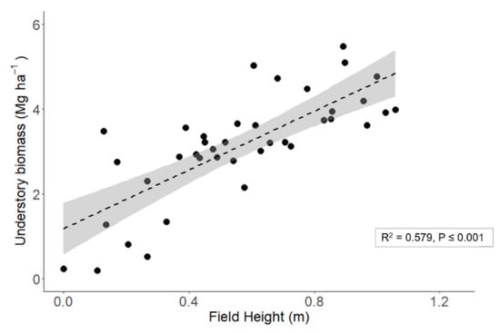 Slope and intercept comparisons performed to compare understory biomass with the field- and LiDAR- derived understory height estimates (Equations (3) and (4)) showed no significant difference between the two methods (slope: field = 3.461, LiDAR = 2.750, p = 0.278, and intercept: p = 0.272).