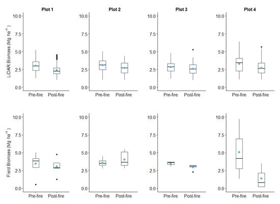 The areas of plots 1–4 were 0.11, 0.10, 0.15, and 0.16 ha, as was defined by the positions of trees monitored for growth and after removing the wetland areas. However, this area included the tree and trunk buffer regions (0.75 m), which were removed for understory analysis (described in Methods). In May 2018 (pre-fire), the mean plot biomass estimated with LiDAR ranged from 2.87 to 3.34 Mg ha−1, while in November 2018 (five months post-fire), the mean plot biomass changed to 2.40 to 2.75 Mg ha−1, or a 12.7% reduction (Table 1). The field sampling method estimated a ~16% reduction in biomass five months post-fire and was much more variable than the estimates from LiDAR (Figure 7). The power analysis using estimated biomass from LiDAR indicated that the field sampling method would have required 59 1 × 1 m sample subplots to detect the estimated 12.7% reduction in biomass.