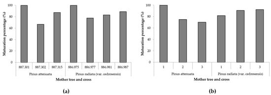 To evaluate the effect of the cross on the maturation percentage, an initial exploratory data analysis was conducted revealing that this percentage was above 80% for all levels of cross but one. Moreover, the maturation percentage was 100% in two levels of cross. With these data, it was not possible to fit any model. Regarding the effect of the treatment and the mother, the exploratory analysis revealed that in four out of the six levels defined by the interaction of both factors, the maturation percentage was above 80% with one level reaching 100%. Therefore, results were based on descriptive statistics. Maturation percentages for the different mother trees and crosses are shown in Figure 2a. Maturation percentages by treatment and mother are shown in Figure 2b (three crosses when P. attenuata acted as the mother tree and four crosses when P. radiata var. cedrosensis acted as the mother tree). Different ECLs analysed for each cross showed a different maturation rate ranging from 67 % (cross 887.302, P. attenuata as mother tree) to 100% (cross 887.301 with P. attenuata as mother tree and cross 886.975 with P. radiata as the mother tree, ECLs from the rest of crosses showed maturation rates between 83 and 89% (Figure 2a). On the other hand, different initiation treatments provoked a variation in the success of the process depending on the species that acted as mother; Treatment 1 was the most successful when P. attenuata was the mother and the worst when this species was the father. As it can be observed in Figure 2b, there was an opposite effect of the treatments: maturation percentage decreased from 1 to 3 when P. attenuata acted as mother and increased when P. radiata was the mother. So, there was a strong effect of the species that acted as mother in the maturation rates obtained.