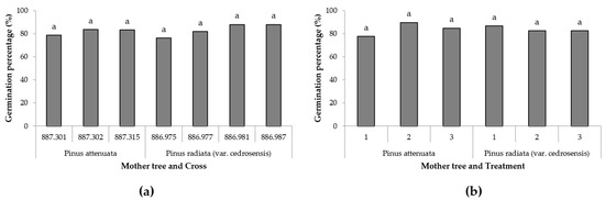 The germination percentage did not show significant differences when the cross was analysed for each mother (Table 4 and Figure 3a). In the same way, when the mother, treatment and interaction were evaluated not significant differences were found (Table 3 and Figure 3b). In both cases, the germination percentages were always above 75%.