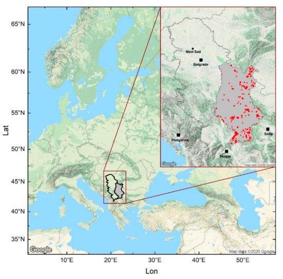 The geographic position of study area, Eastern Serbia, is marked in gray (latitudes 42.27–44.82° N and longitudes 20.90–23.01° E) with the layer of forest fire hotspots obtained by NASA’s Fire Information for Resource Management System (FIRMS) (MODIS fire hotspot) for the period of 2001–2018.