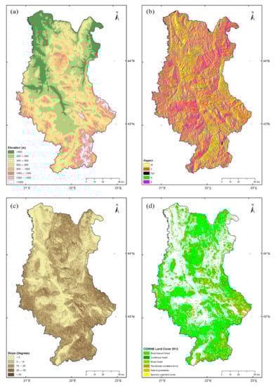 Categorical predictors related to forest fire in Eastern Serbia. (a) Classes of elevation; (b) aspect classes; (c) slope categories; (d) land cover categories obtained by CORINE 2012.