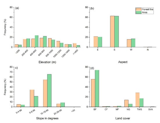 Forest fire distributions across the categorical explanatory variables are displayed in Figure 3. An almost normal distribution of forest fires was recorded across elevation classes, with higher frequencies at elevations between 200 and 1000 (with a less pronounced peak in the class of 600−800 m), and with lower frequencies below and above this range (Figure 3a). The frequencies of forest fire across elevation classes highly correspond to surface area covered by the respective classes (χ2 =39.83, p < 0.001). This connection was not significant between forest fire occurrence and aspect classes (χ2 = 1.11, p < 0.774). Regarding aspect, the highest frequencies of fires occurred on southern aspects, then almost equally eastern and western aspects, while the lowest frequency was recorded on northern aspects (Figure 3b). The highest frequency of forest fire was recorded on the slopes with an inclination between 10° and 19.99°, then between 5° and 9.99°, while the lowest frequency was recorded at the lowest inclination (0−4.99°). No fire was recorded at the highest inclination of over 30° (Figure 3c). Forest fires were influenced by slope (χ2 = 47.54, p < 0.001). Also, land cover type had a significant influence on forest fire occurrence (χ2 = 107.89, p < 0.001). More than 55% of forest fires occurred in broad-leaved forests, and almost 29% and 14% occurred in the transitional woodland-shrubs and natural grasslands respectively, while less than 2% of forest fires occurred in the mixed forest and coniferous forests. No forest fire was recorded in the sparsely vegetated area (Figure 3d).