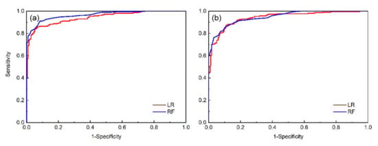 Receiver operating curve (ROC) for LR and RF models: (a) training data set, (b) validation data set.