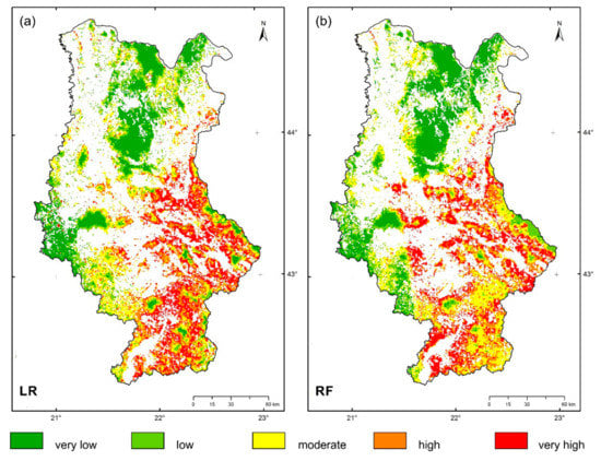 Forest fire occurrence probability calculated by the LR or RF models for fire cells and non-fire cells was used to map the forest fire occurrence probability in Eastern Serbia in ArcGIS 10.2. According to Nhongo et al. [34], the produced map was classified into five categories: very low (0.01−0.20), low (0.21−0.40), medium (0.41−0.60), high (0.61−0.80), and very high (0.81−1.00).