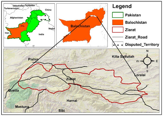 Ziarat district lies in one of the six divisions of Balochistan province and happens to have one of the second-biggest reserves of juniper forest in the world. Juniper forest is unevenly spread between the two tehsils of Ziarat District, which are Sanjavi Tehsil and Ziarat Tehsil. Figure 1 shows the study area map of district Ziarat Balochistan.