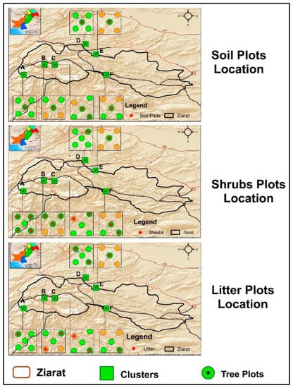 The above-ground biomass was calculated for all the plots, however, only one soil sample was collected from the primary plot of each cluster thus giving us six soil samples. Plots for above-ground biomass, shrubs, litter and soil had a radius of 17.8 m, 5.64 m, 0.56 m respectively, keeping in mind that soil and litter plots have the same radius. Shrubs and litter samples were collected as per their availability, and their location data points are displayed in Figure 2.