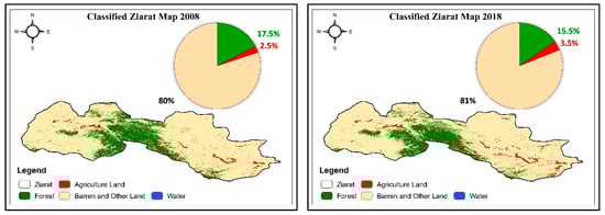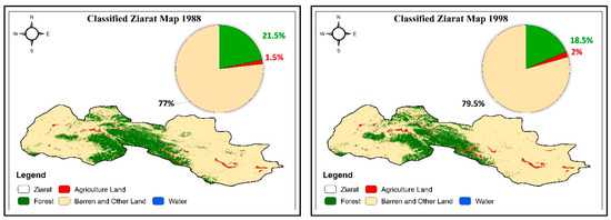 Table 3 below shows the accuracy assessment of the land-use maps of Ziarat district. Accuracy assessment was performed in Arc Map using the confusion matrix, where 140 training points were selected for each temporal map. The confusion matrix shows producer’s and user’s accuracy for each land-use category of the respective yearly maps. Accuracy from the perspective of the map designer is termed as the producer’s accuracy and it shows the probability of whether land cover has been classified correctly. User’s accuracy tells us the correctness of the map from a user’s viewpoint. It tells us the probability of how often the classified class on the map will be present on the ground [36,37]. It is quite high and above 90%. The overall accuracy of the classification for 1988, 1998, 2008 and 2018 was 0.97, 0.98, 0.98, and 0.97. Kappa analysis was undertaken if the performance of the classification did well in comparison to randomly assigning values. This ranged from −1 to 1 and a value of zero represents that the classification was no better random value assignment [36,37]. The Kappa coefficient was 0.96, 0.98, 0.97 and 0.96, respectively, for each consecutive year.