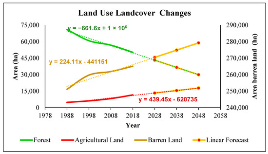 Figure 4 also shows the linear forecast values inferred for next 30 years. The forecast analysis shows that the forest area will decrease to 29,976.5 hectares in 2048, while the agricultural and the barren land area will increase to 17,826.7 hectares and 279,259 hectares, respectively, in the coming three decades.