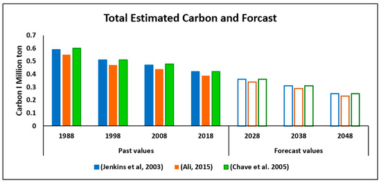 Total forest carbon in million tons using the equations of Jenkin et al. 2003, Ali (2015) and Chave et al., 2005 from 1988 to 2018 and for the future 30 years using linear forecast analysis.