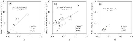 Figure 1. Relationship between the stomatal conductance index (Ig) estimated by the leaf temperature and actual stomatal conductance measured by gas exchange. The measurements in (AC) were measured on different days: 27 July, 2 August, and 1 October, respectively.