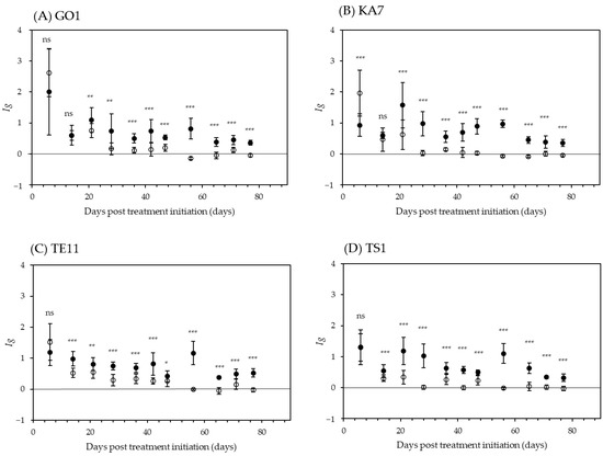 Figure 2. Changes in the stomatal conductance index (Ig) in the four clones. (AD) show the results obtained for GO1, KA7, TE11, and TS1, respectively. Open and closed circles denote the drought and control treatments. Statistically significant differences in the Ig between treatments at each day post-treatment (dpt) for each clone were evaluated by Student’s t-test (ns: not significant, *: p < 0.1, **: p < 0.05, and ***: p < 0.01).