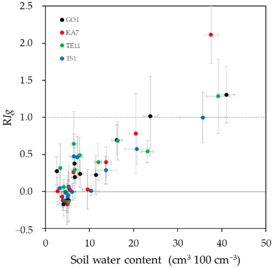 Figure 2 shows the weekly changes in Ig from 9 May to 1 August. The Ig values for GO1 and KA7 in the drought treatment were significantly lower than those of the controls at 21 days post-treatment (dpt), while, in both TE11 and TS1, the first significant differences between the control and drought treatments were observed at 14 dpt. As the experiment progressed, Ig approached zero at 28 dpt in KA7 and TS1 and at 56 dpt in GO1 and TE11. As shown in Figure 3, the RIg tended to decrease with the SWC under the conditions of drought treatment. In C. japonica, the RIg tended to decrease towards zero when the SWC decreased from about 0.25 cm3 cm−3 to 0.15 cm3 cm−3.
