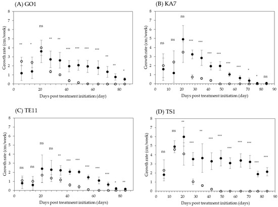 Figure 4. Temporal changes in the growth rates in the four clones. (AD) show the results of GO1, KA7, TE11, and TS1, respectively. Open and closed circles denote the drought and control treatments. Statistical significance of the growth rates between treatments at each dpt for each clone was evaluated by Student’s t-test (ns: not significant, *: p < 0.1, **: p < 0.05, and ***: p < 0.01).